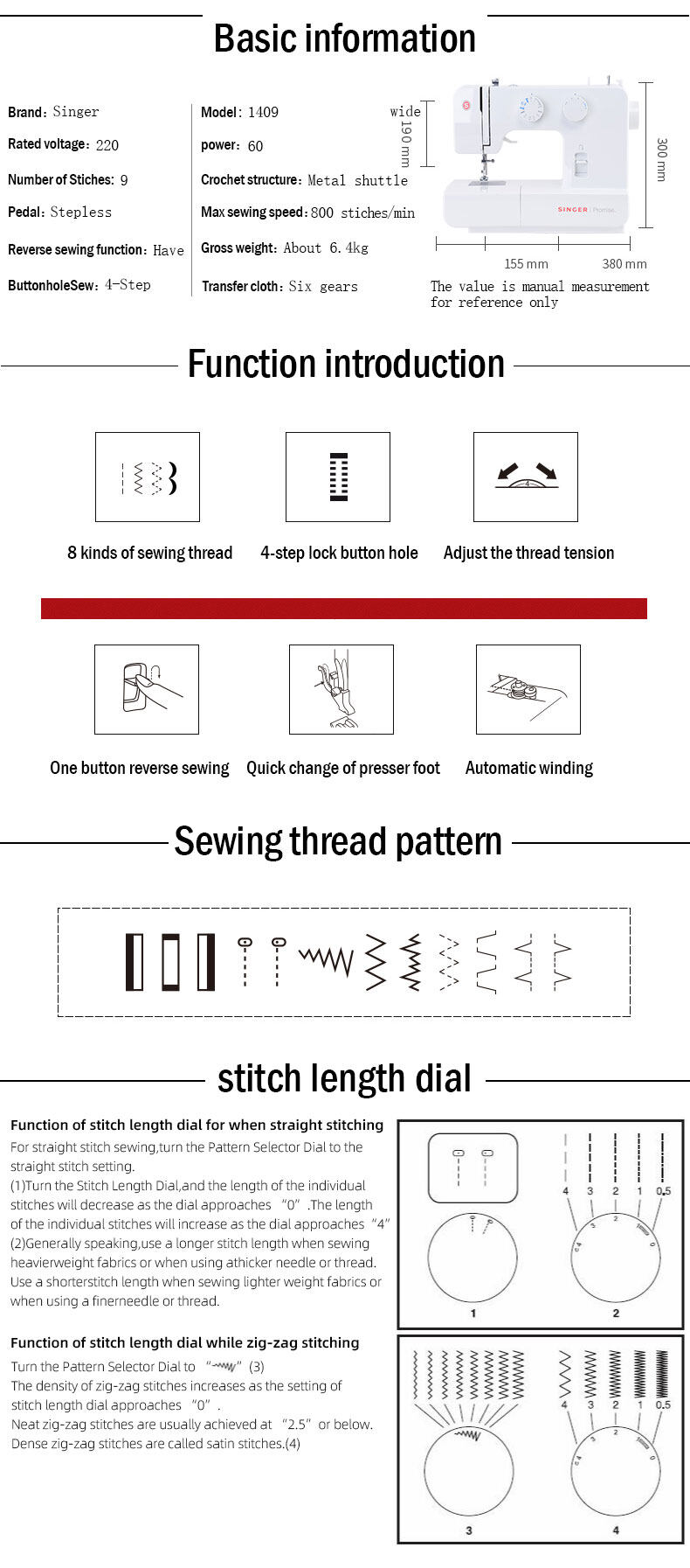 Highlights:9 automatic stitches800 stitches per minuteMotorised 70 watts2 needle positionsAutomatic bobbin winding4-step buttonholeEmbroidery featureZipper insertionTwin needle capabilityPush lever reverseStitch pattern indicatorStitch length control dialer (1409 upgraded feature)Accessories included: all purpose foot, zipper foot, buttonhole foot, button sewing foot, edge/quilting guide, darning plate, spool cap holders, screwdriver, bobbins, needles, lintbrush/seam ripper and oil bottle. Free sewing platform.Weight 6.5KgSize H38x W46.5 x L24.5 cmValue package with more practical accessories,welcome to buy our products.1 year warranty