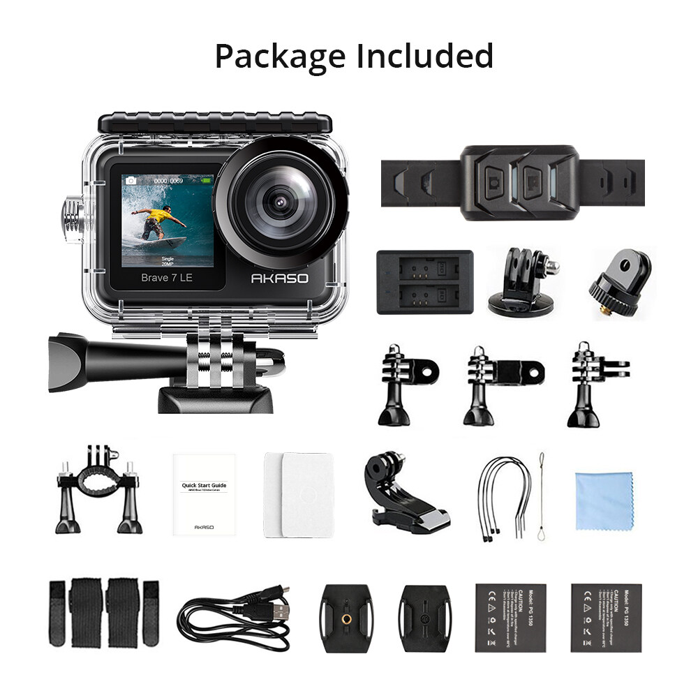 1x AKASO Brave 7 LE Action Camera/ 1x Remote Control/ 2x 1350mAh Battery/ 1x Waterproof Case/ 1x Battery Charger/ 1x Bicycle Stand/ 6x Mount/ 2x 2-sided tape/ 2x Helmet Mount/ 1x Bandages/ 5x Tethers/ 1 x Protective Backdoor/ 1x USB Cable/ 1x Lens Cloth/ 1x Quick Reference Guide