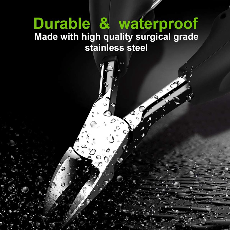 [SELECTED KIT] Professional ingrown toe nail clippers tools kit(4-in-1), superior stainless steel refined. It's hard, sharp, antirust and durable, so these nail tools are also the first choice for dealing with thick and hard nails. [UPGRADED CLIPPER] Nail clippers with non-slip ergonomic handle and large opening, takes less hand force to cut all size nails, including ingrown toenail, thick toenail, hard nail, grey nail, grooved nail etc. The sharp curved blade edge like eagle mouth fits the nail arc closely, is good at deeping into the nail groove to trim ingrown toenails. [SPECIAL FILE] This 4 side nail file can be used for manicure of hard and thick toenails and can make your nails smoothly. [SUPPORTING TOOLS]The 2-in-1 double ended pusher can push down cuticles, the polish gel residue,the dead skin and top coat on nails. The nail lifter with mini spoon can clean the debris or dirty inside nails. Tips: Be sure to push only one spring to the side of the cutting edge before use the clipper. Do not use the double spring at the same time Keep the set out of reach of children Pay attention to safety to avoid accidental injury Color: Black + Silver Material: Plastic + Metal Package Contents: 1 * Nail Lifter 3 * accessories