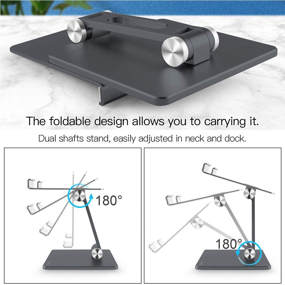 • 【STABLE & ADJUSTABLE】: Dual shafts Stand, easily adjusted in neck and base (both 180°rotating angle) , provides you multiple viewing angles and heights. The foldable design allows you to completely free your hands and carry it with you when traveling.