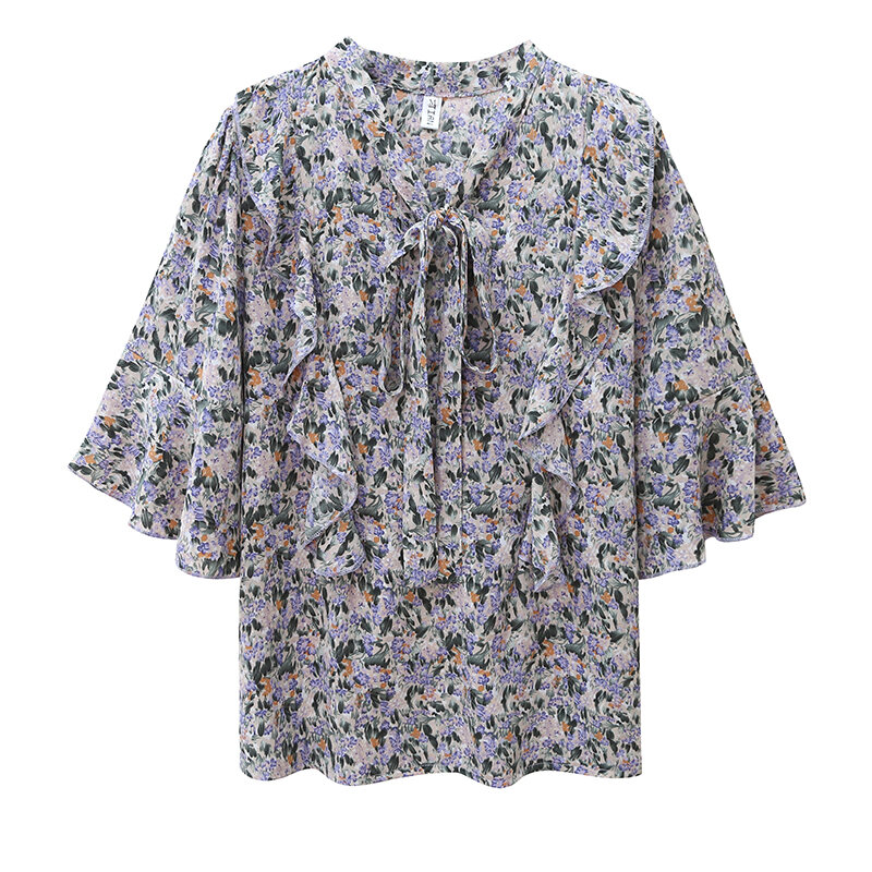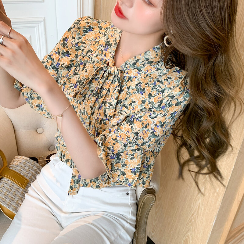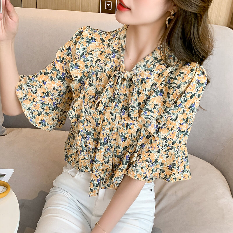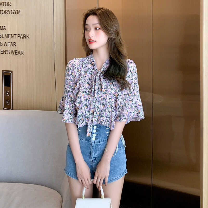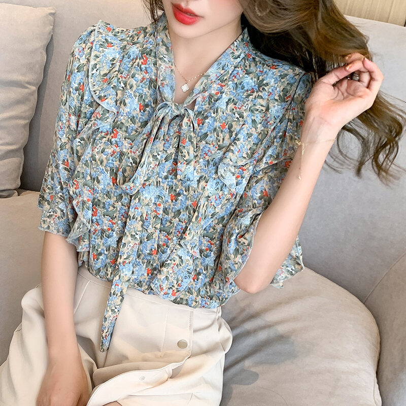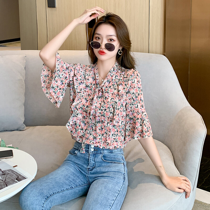 Summer Floral Bow Chiffon Shirt Loose French Style Niche Student Short-Sleeved Chiffon Shirt Women's Top