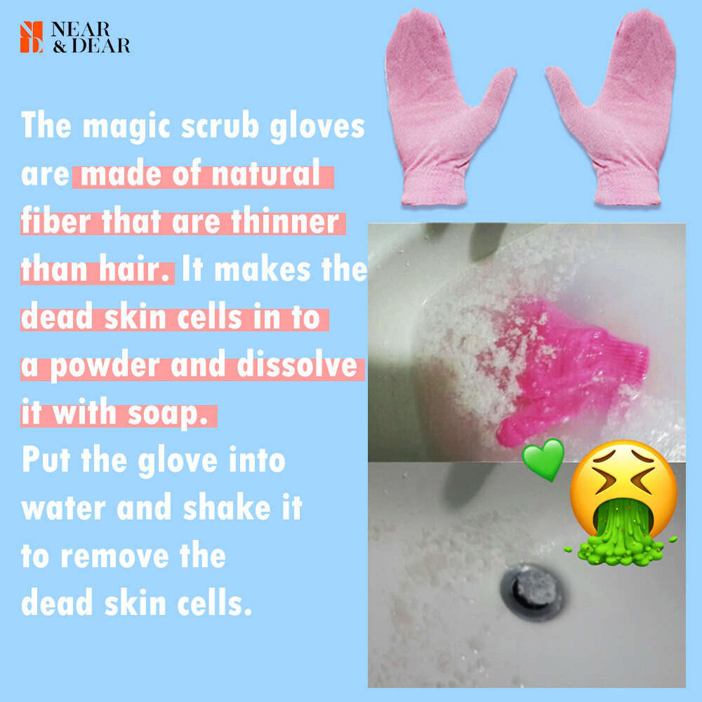 -The magic scrub gloves are made of natural fiber that are thinner than hair. It makes the dead skin cells in to a powder and dissolve it with soap. Put the glove into water and shake it to remove the dead skin cells.