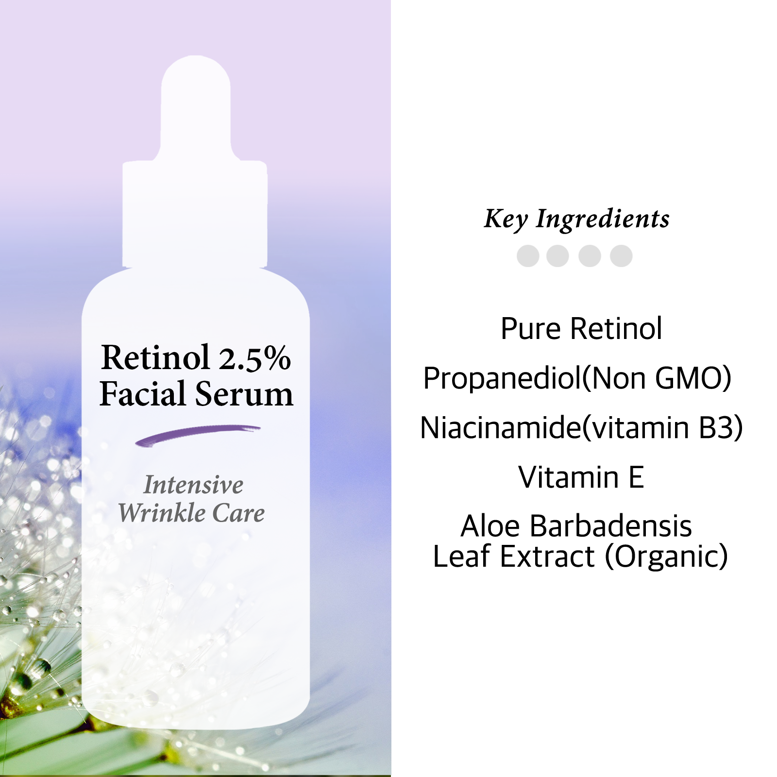 *Aloe Barbadensis Leaf Extract(hydration/skin replenishing/Vegetable), (hydration, Non GMO Corn),Retinol(skin-restoring, anti-wrinkles), Sodium Hyaluronate(hydration/skin replenishing), niacinamide(vitamin B3, skin-restoring ), 1,2-Hexanediol(Prevent oxidation), Polysorbate 20(texture enhancer), Tocopheryl Acetate (Vitamin E), *Rosa Damascena Ext,*Lavandula Angustifolia Flower Ext,*Camellia Sinensis Leaf Ext,*Melissa Officinalis Leaf Ext,*Artemisia Vulgaris Ext, Disodium EDTA *Mark: Organic Ingredients. Organic 50%