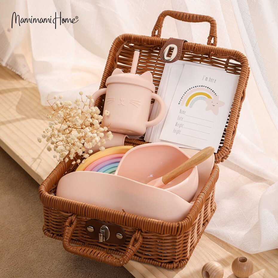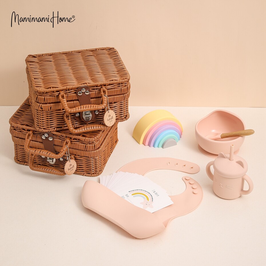 3.Powder Blue Set: 1 x Silicone Bib,1 x Silicone Spoon,1 x Sippy Cup,1 x Silicone Bowl,1 x Silicone Building Block,1 x Rattan Box,16 x Milestone Cards