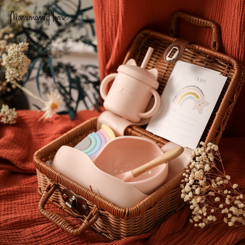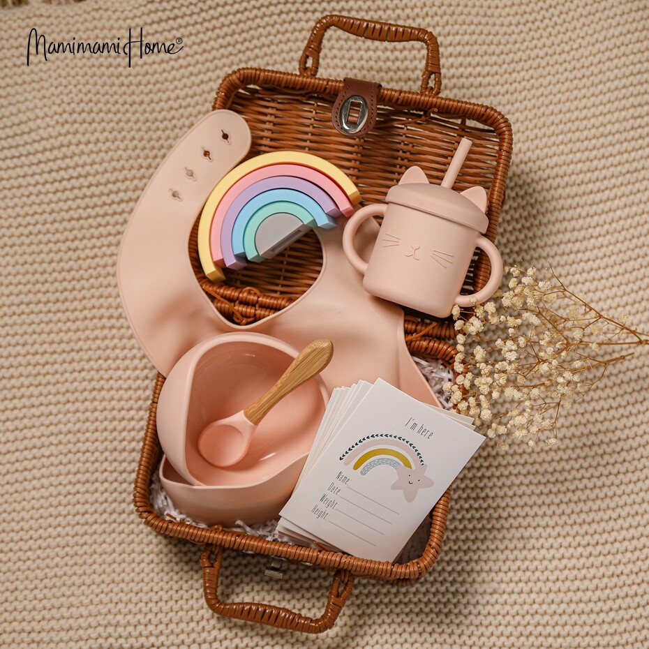 2.Peach Set: 1 x Silicone Bib,1 x Silicone Spoon,1 x Sippy Cup,1 x Silicone Bowl,1 x Silicone Building Block,1 x Rattan Box,16 x Milestone Cards