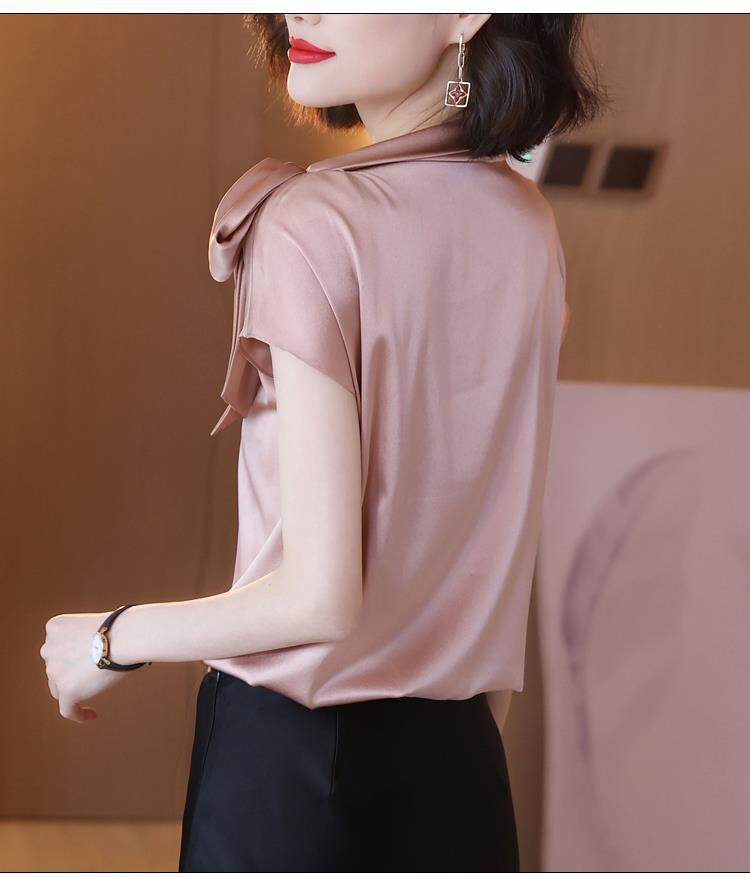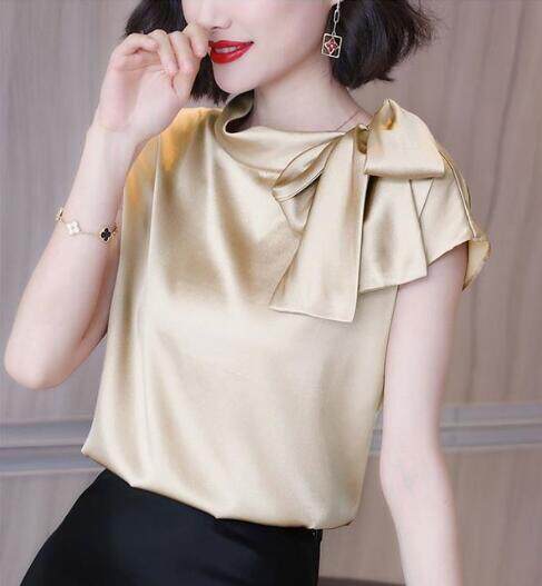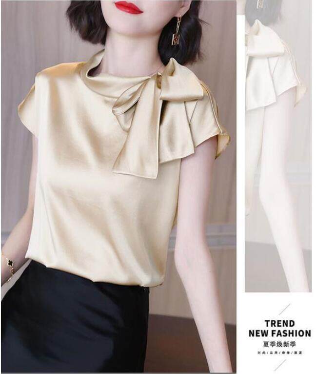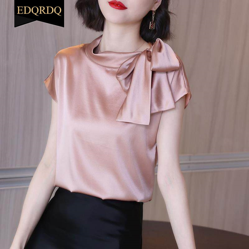 EDQRDQ Women's Casual Side Bow Tie Neck Short Sleeve Satin Blouse Shirt Top