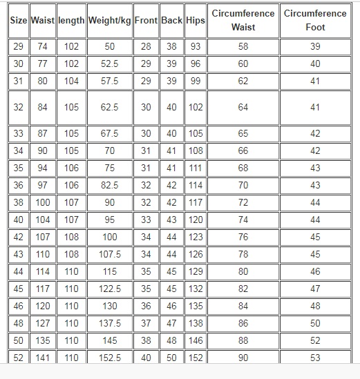 | Size | Waist | length | Weight/kg | Front | Back | Hips | Circumference Waist | Circumference Foot |
