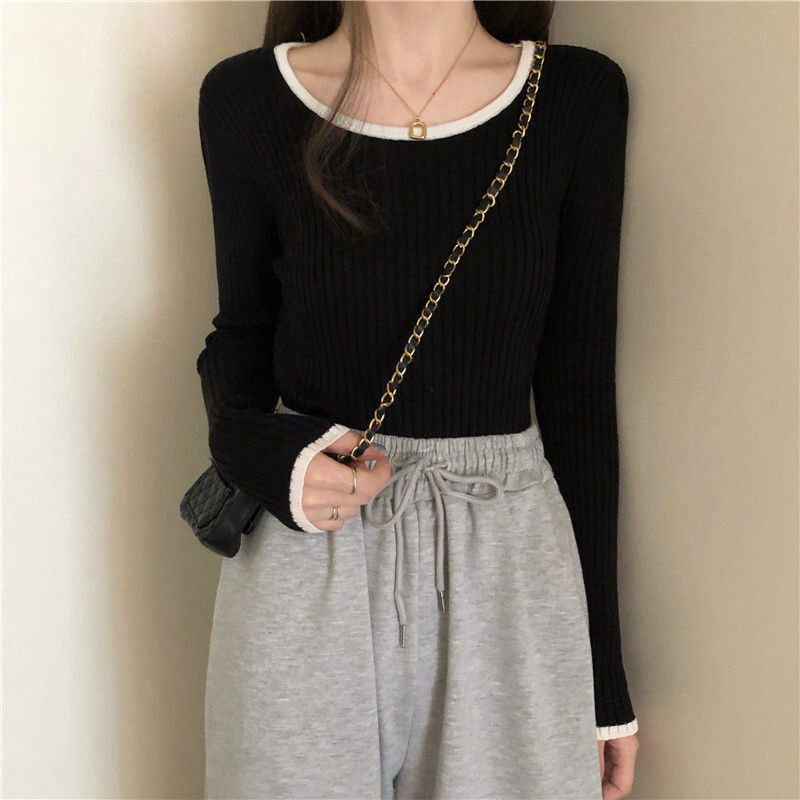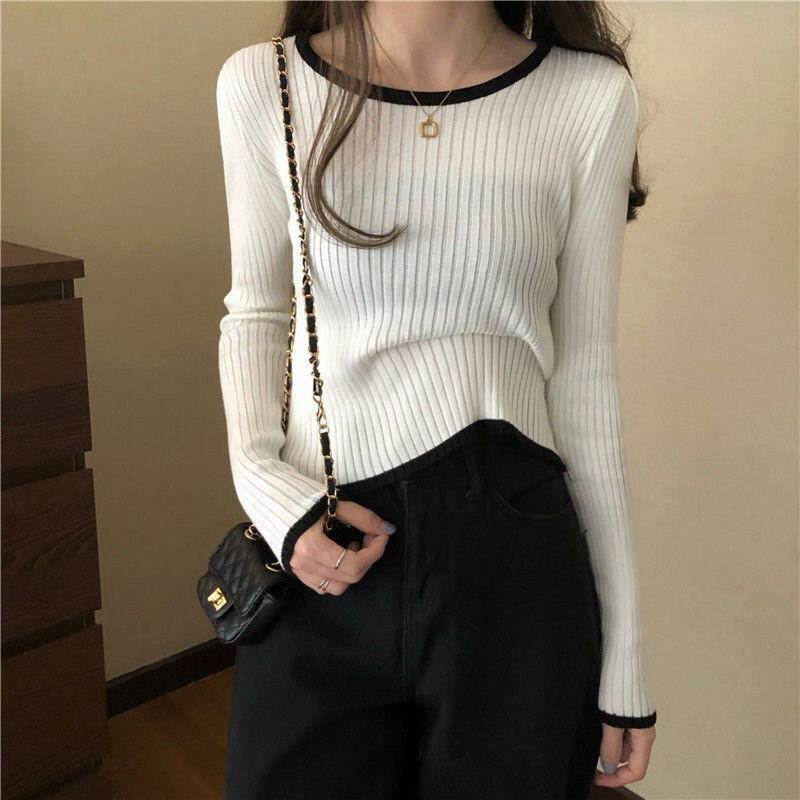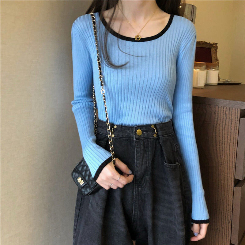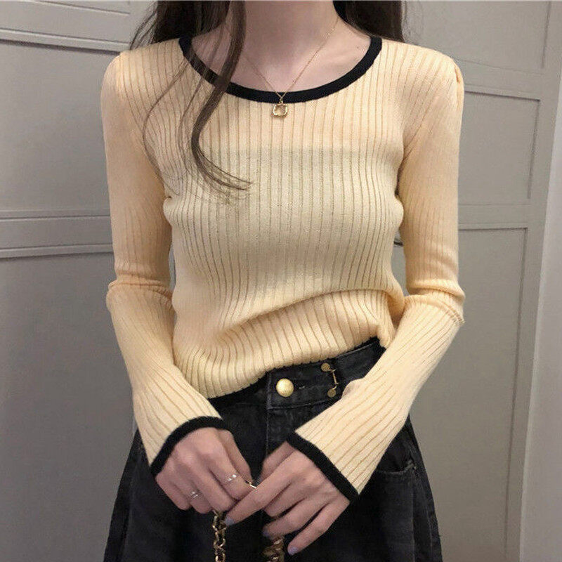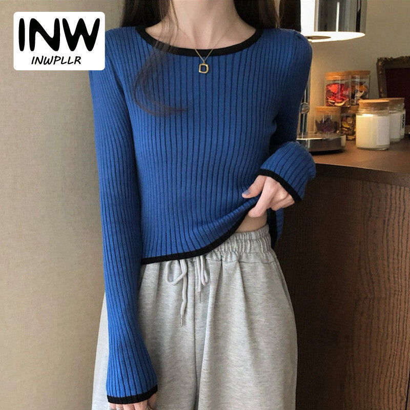 • INWPLLR Korean Style Women's Tshirts Solid Knitted Tops Tees Multi Colors Female Tops Casual O-Neck Long Sleeve T-shirts