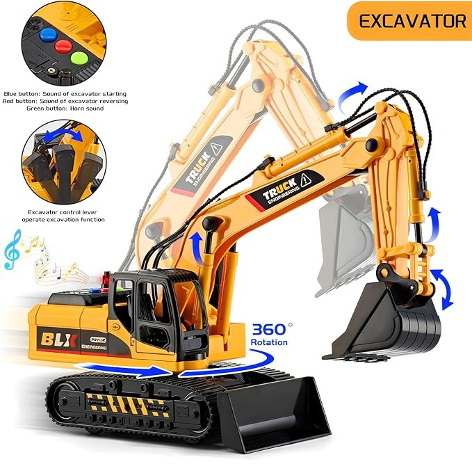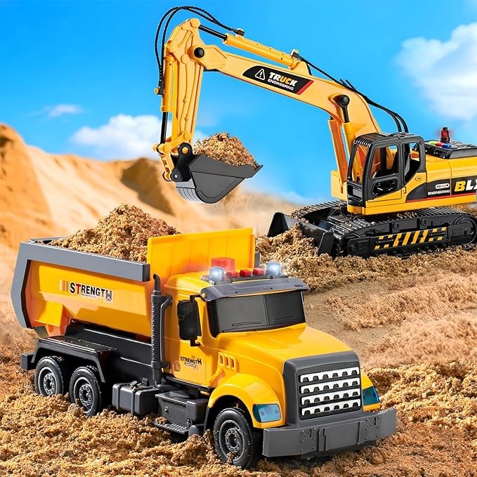 Interactive Features: The excavator has a 360° rotating cab and a manipulable digging arm via the side lever, enabling realistic scooping. the dump truck allows kids to lift and lower the rear bed by Continuously press the up button on the top of the car and the down button on the fuel tank position, and it comes with 20 plastic stones for loading and unloading action.