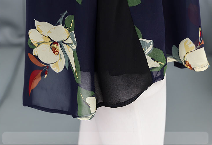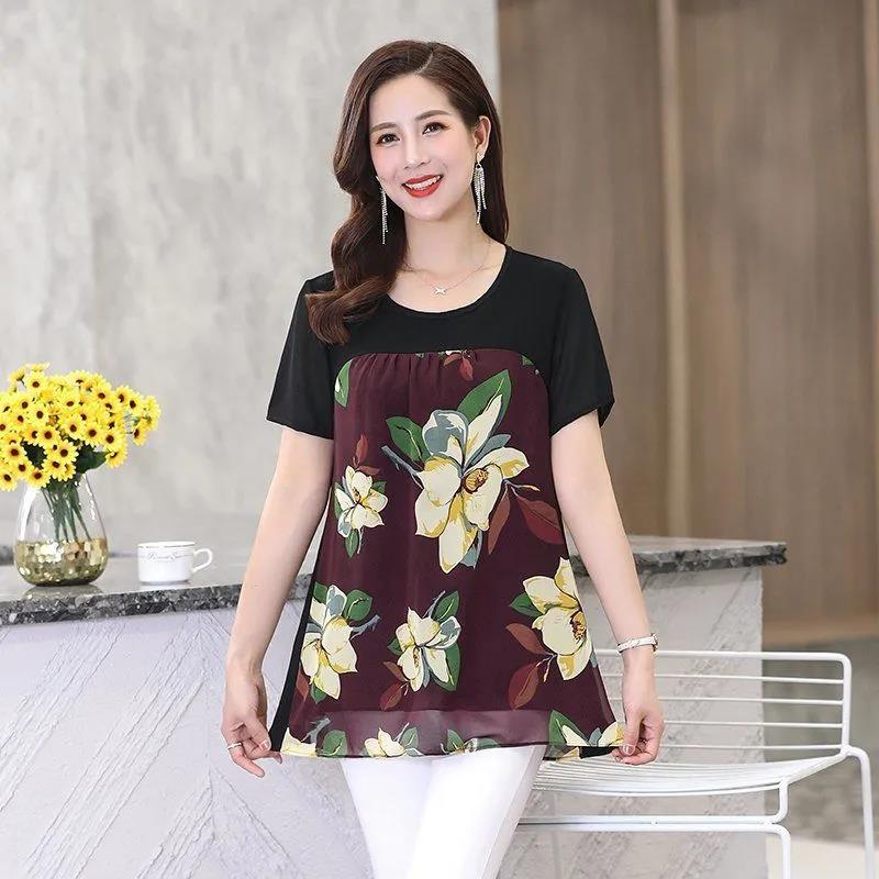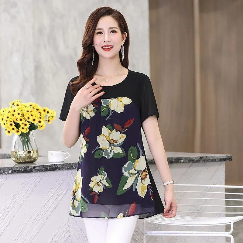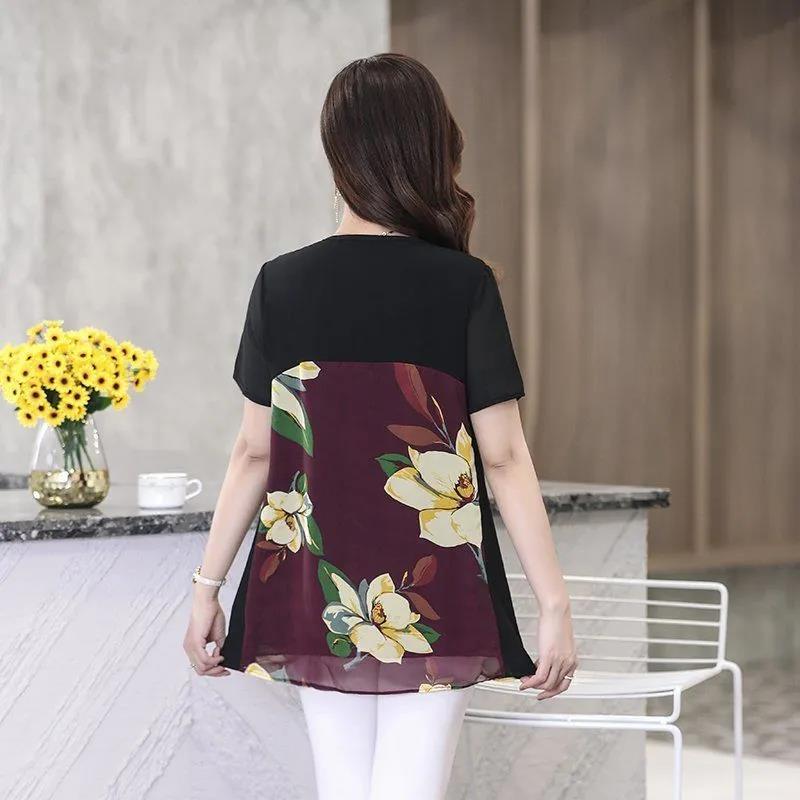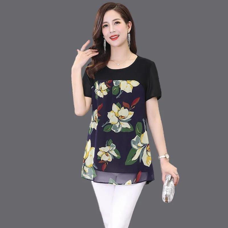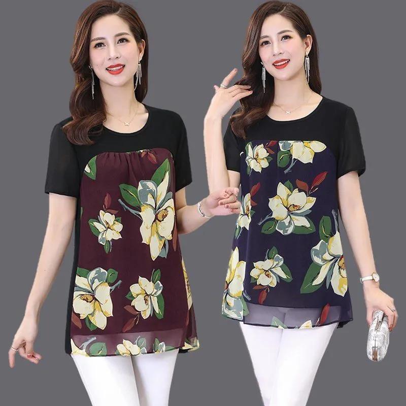 EDQRDQ Womens Lightweight Double-Layered Printed Chiffon Short Sleeve Mesh Blouse Loose Flowy Tops with Elasticity