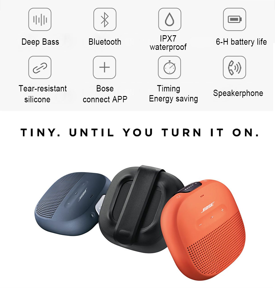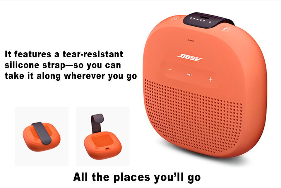 When a portable speaker is this small and powerful, you'll never leave it behind. So when adventure is calling, grab the SoundLink® Micro Bluetooth® speaker on your way out the door and make the best of every moment. This small speaker is at home in your hand. And it delivers crisp, balanced sound and unmatched bass for its size. Bose did it with a custom mounted transducer and passive radiators that produce sound that's loud and clear—even outside.