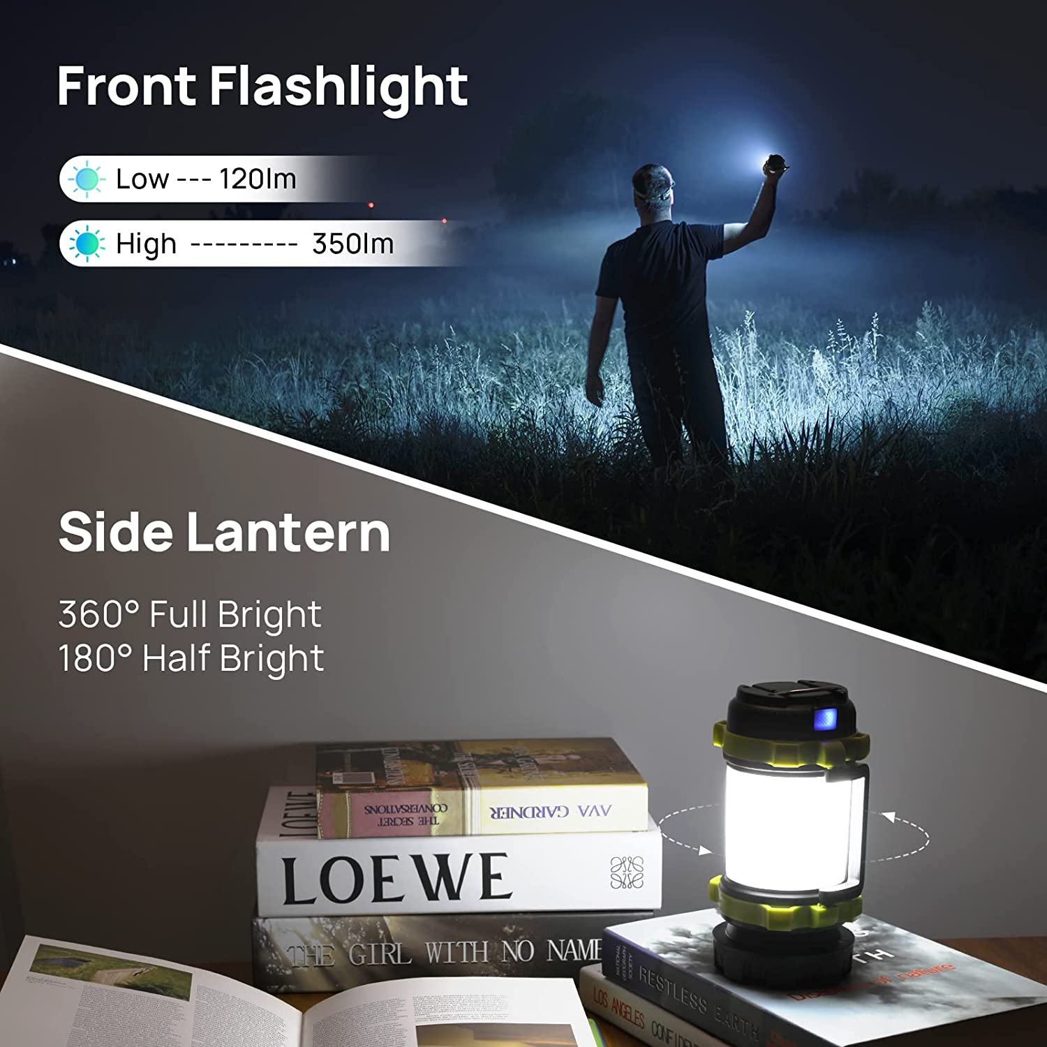 Shorter and smaller than an outdoor bottle, weighed no more than 347g (0.74lb), this portable LED camping lantern is easy to carry and pack. It is designed with a carry handle and two-way hook. You can hang it on tent, backpack, and branches. Free your hand and save your space.