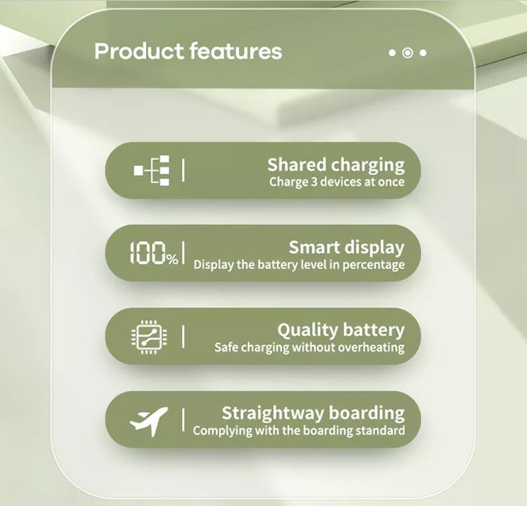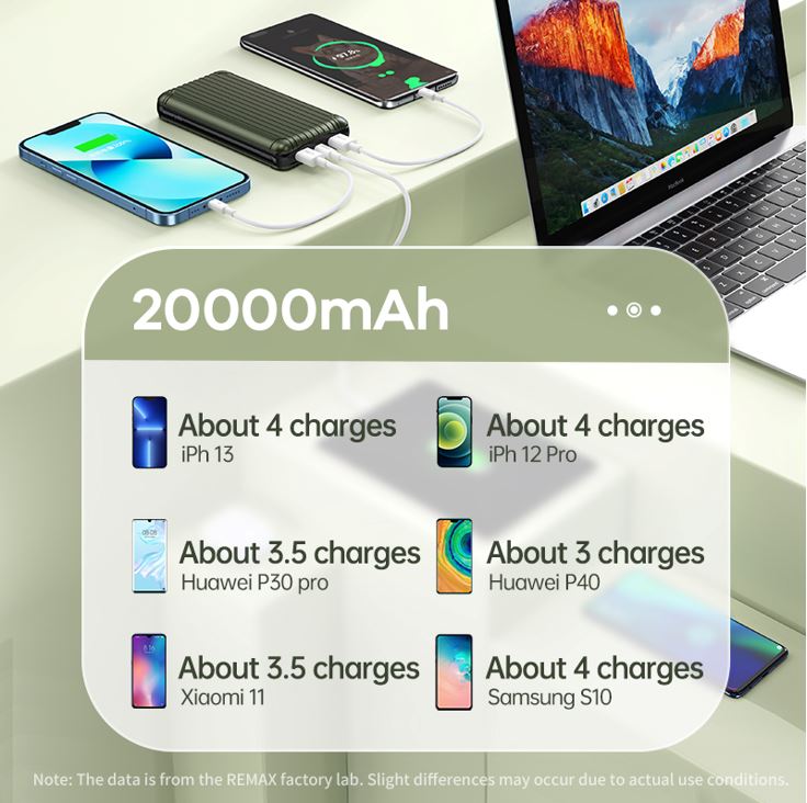 Brand REMAX Model No.PD-P85 Cell type Polymer lithium ion battery Battery Type Square aluminum shell Colour: Cyber Greeb Power Capacity : 20000 mAh (74Wh) Micro Input : 5V⎓2A / 9V⎓2A / 12V⎓1.5A Type C Input : 5V⎓3A / 9V⎓3A / 15V⎓3A / 20V⎓3A (60W) Max Type C Output : 5V⎓3A / 9V⎓3A / 15V⎓3A / 20V⎓3A (60W) Max USB1Output : 4.5V⎓5A / 5V⎓2A / 9V-10V⎓2A / 12V⎓1.5A (30W) Max USB2 Output : 4.5V⎓5A / 5V⎓2A / 9V-10V⎓5A / 12V⎓1.5A (50W) Max