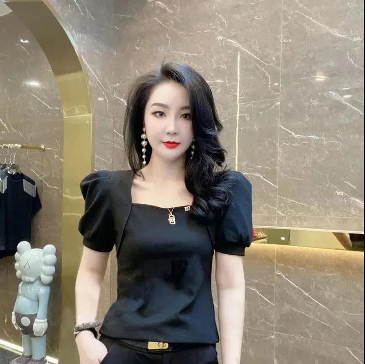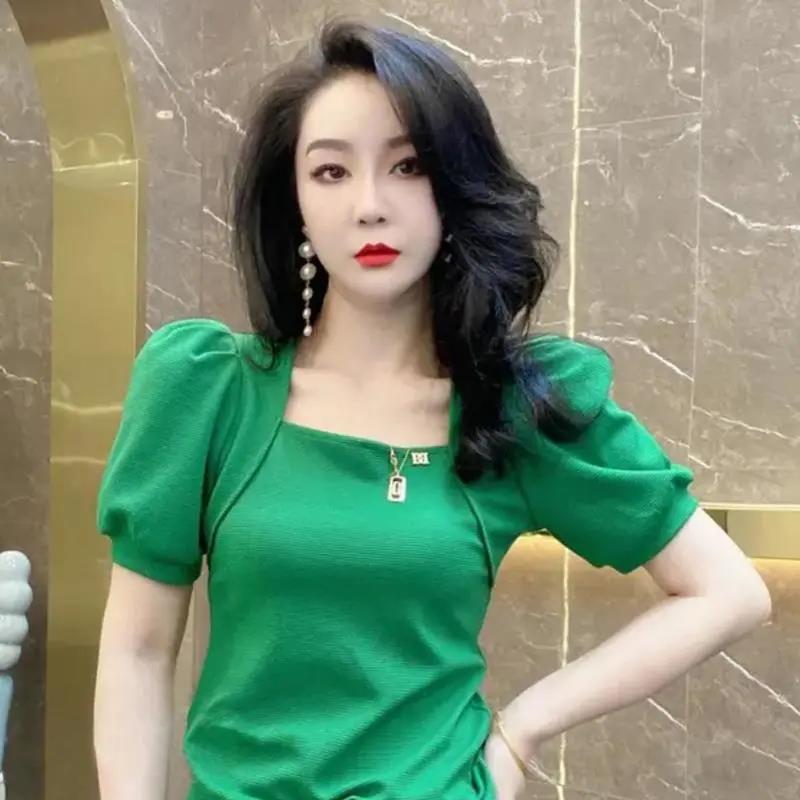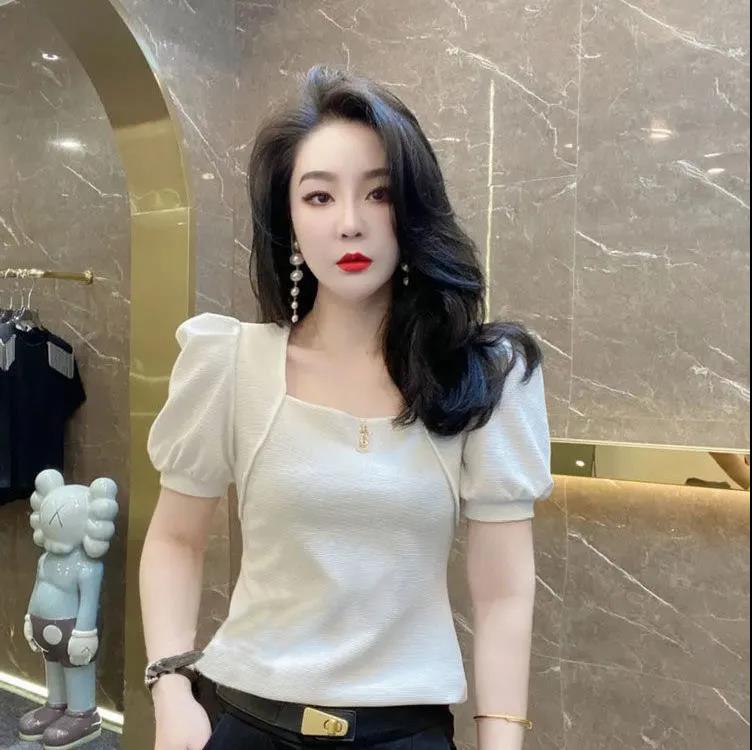 EDQRDQ Women's Puff Sleeve Square Neck Short Sleeve Elegant Slim Fit Tee Top