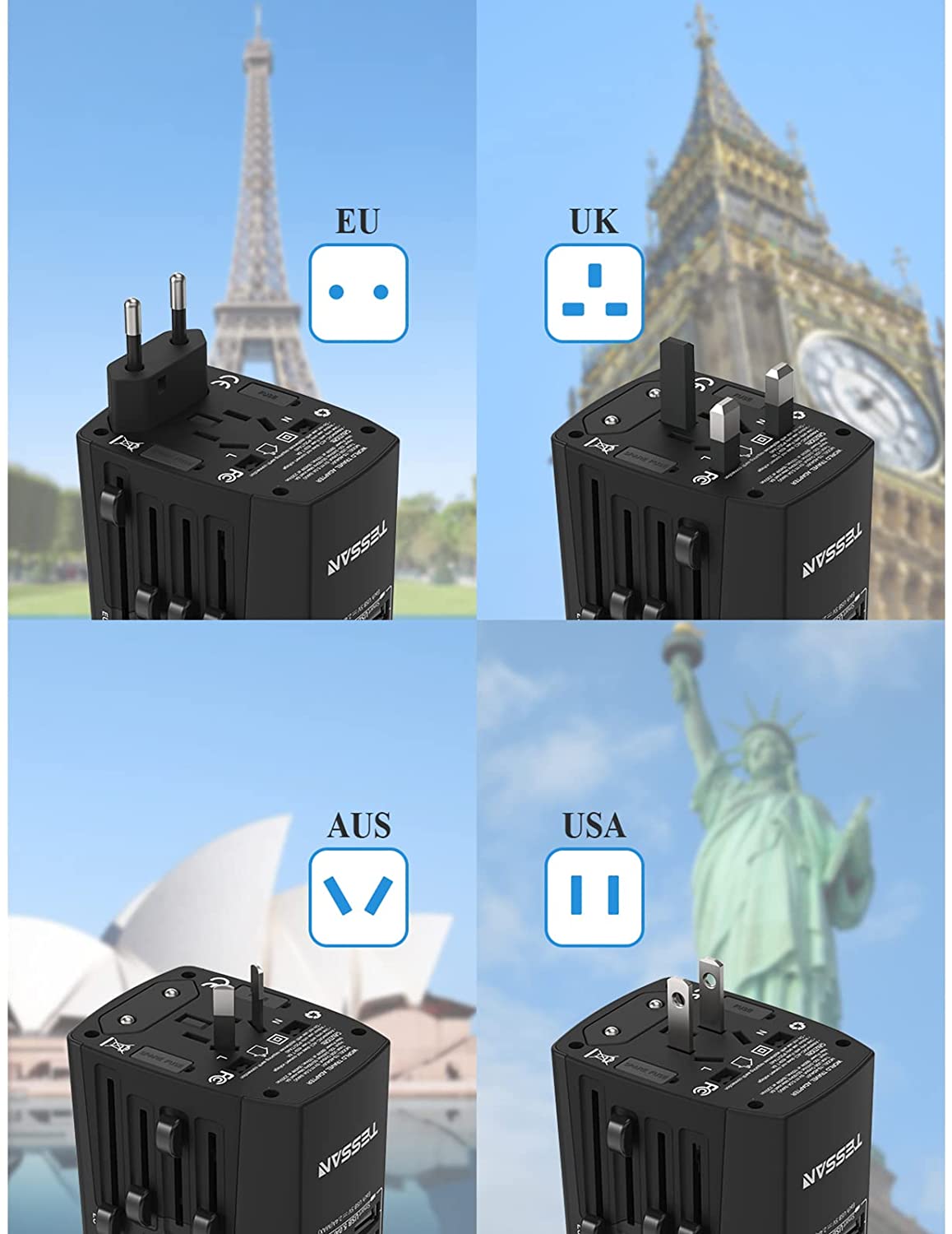TESSAN Universal Adapter USB International Travel plug Worldwide USB Charger for 224+ Countries Travel Plug Adaptor with 4 USB Ports + Universal AC Charging for International Use for Europe Germany UK