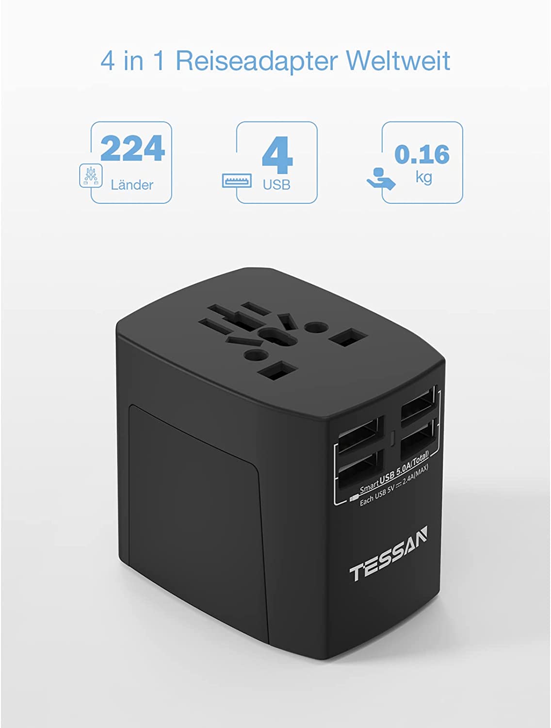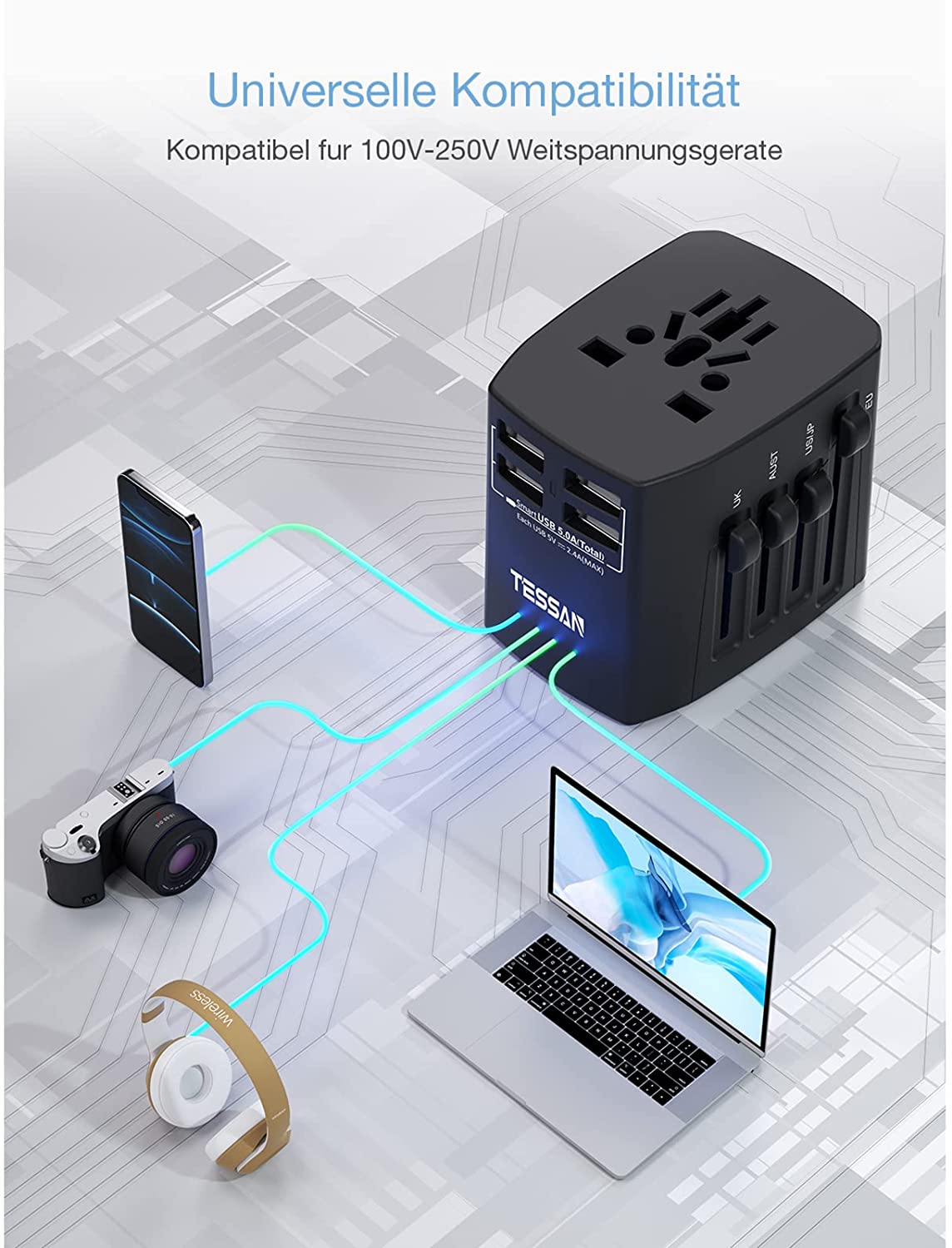 • 4 integrated USB ports with output in total 5.0 A max, the integrated Smart IC automatically detects your devices and delivers the fastest possible current of up to 2.4 A per USB port. TESSAN Power Adapter Ideal for using devices for charging, e.g. cameras, laptops, MP3 etc. Please check that the rated power of your device does not exceed the maximum performance of our products before using heavy duty devices.