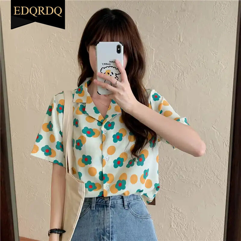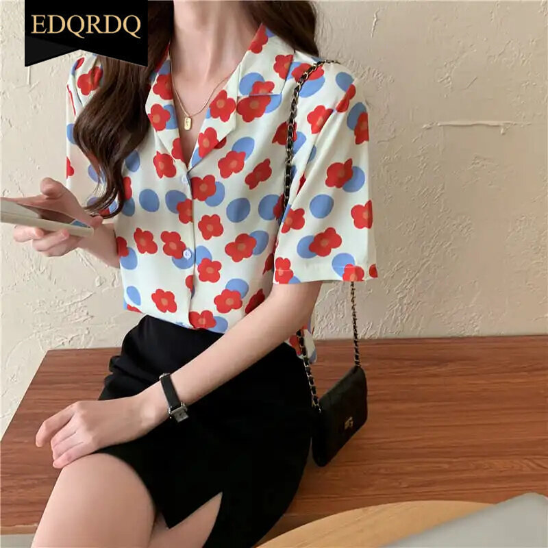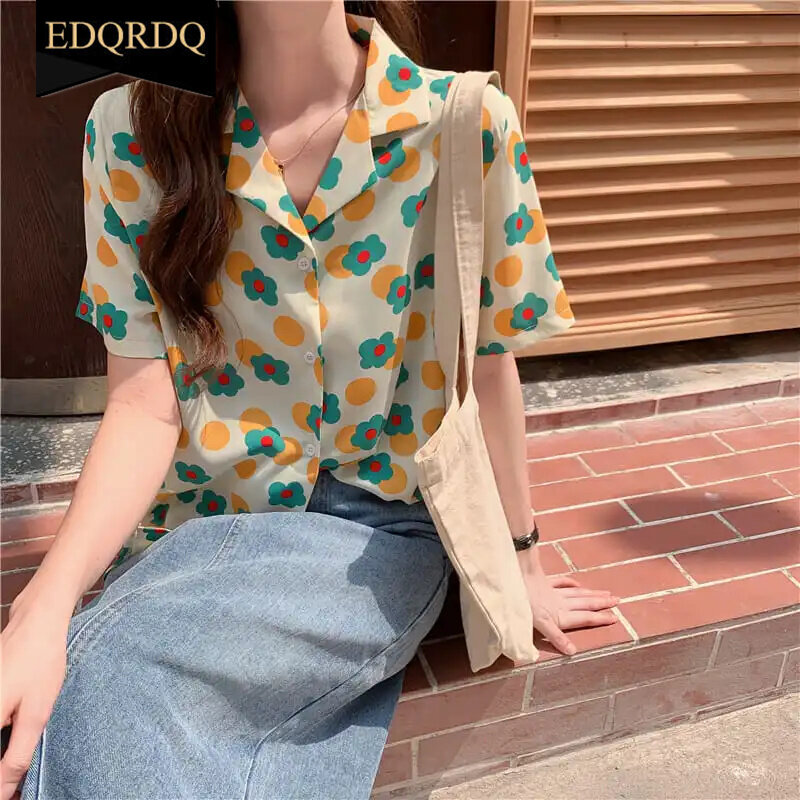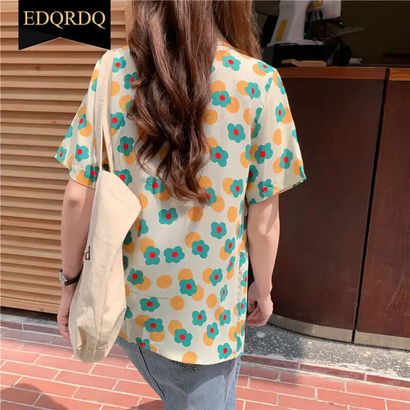 EDQRDQ Floral Shirts Summer Vintage Loose Polo Neck Casual Office Blouses