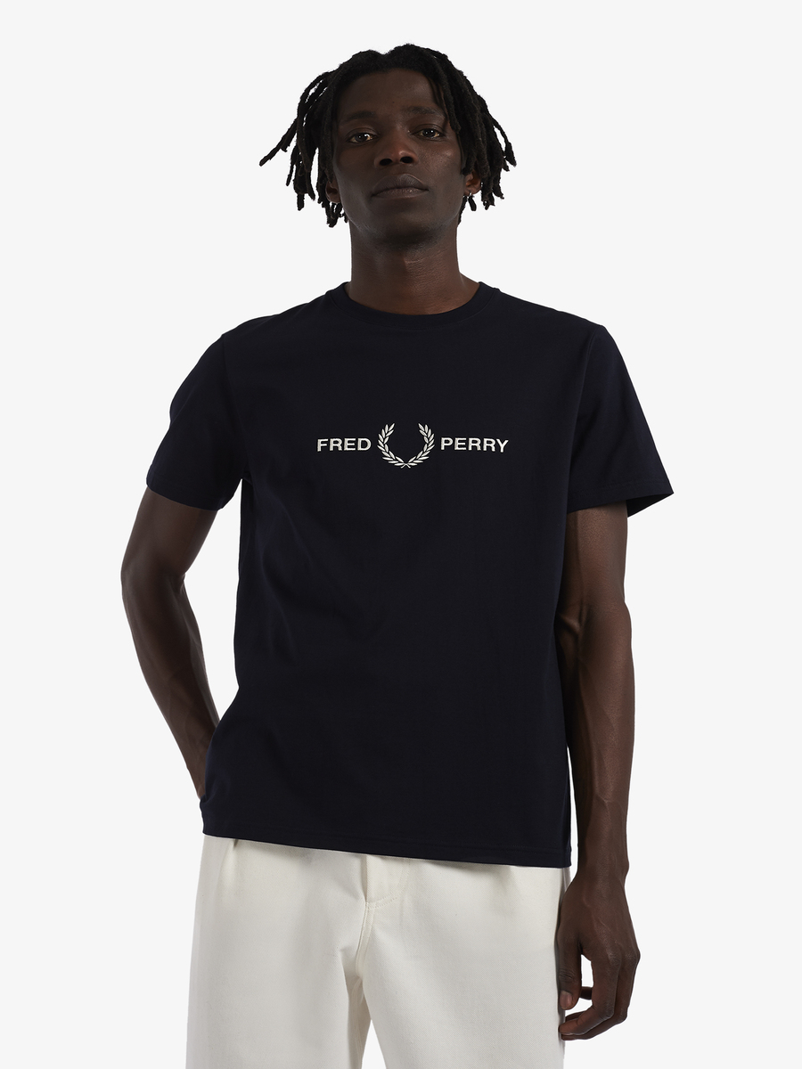 Cotton jersey / Regular fit / Graphic branding embroidery / Printed back branding / Ribbed crew neck .