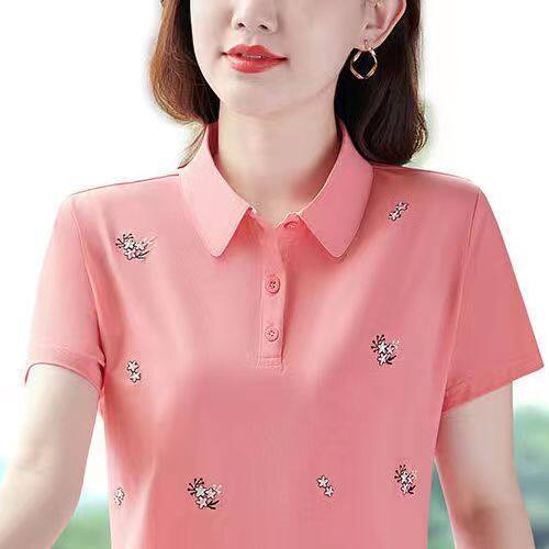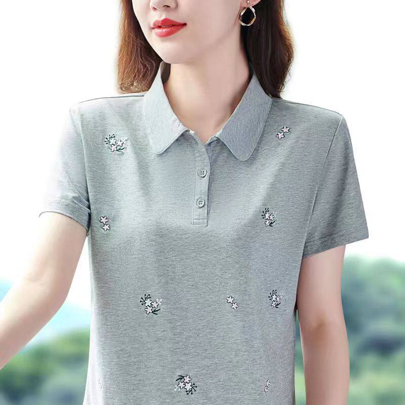 100KG Fat Girl Can Wear Elegant Floral Women Short Sleeve Polo Shirt Middle age mother Casual Sport Running Clothes Fashion Plus Size Blouse Ladies Lapel T-shirt Stretch