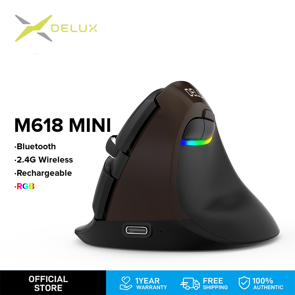 【11 11 Sales】Delux M618 Mini 4.0 2.4GHz dual model Wireless Vertical Mouse 4 Gear DPI RGB Ergonomic Rechargeable Silent click Mice for Office dard golden