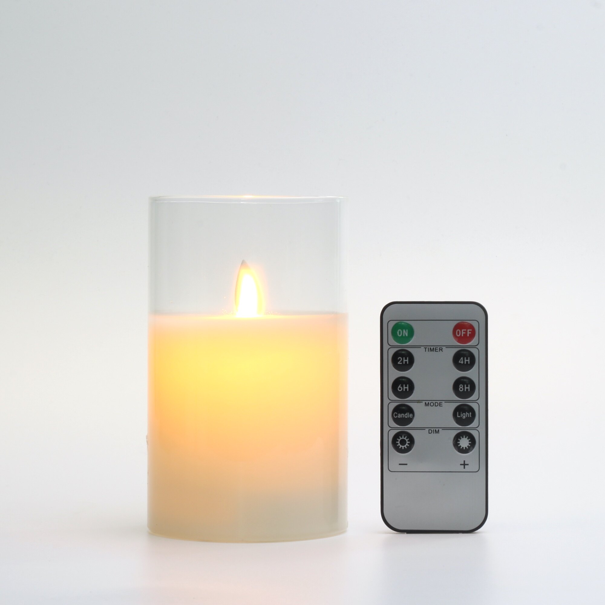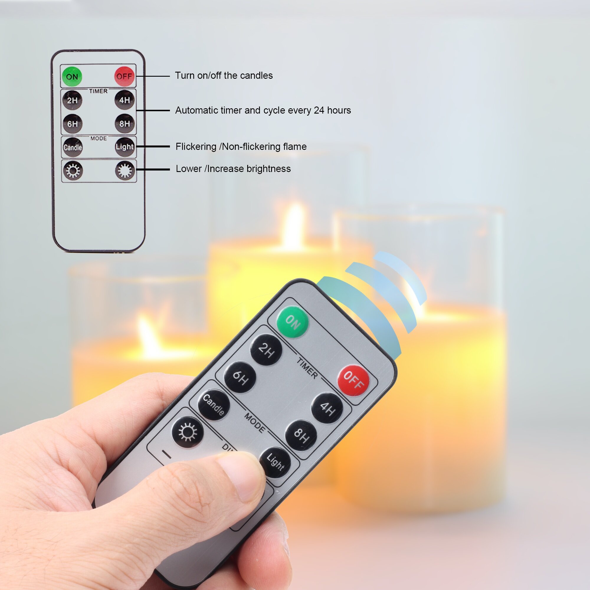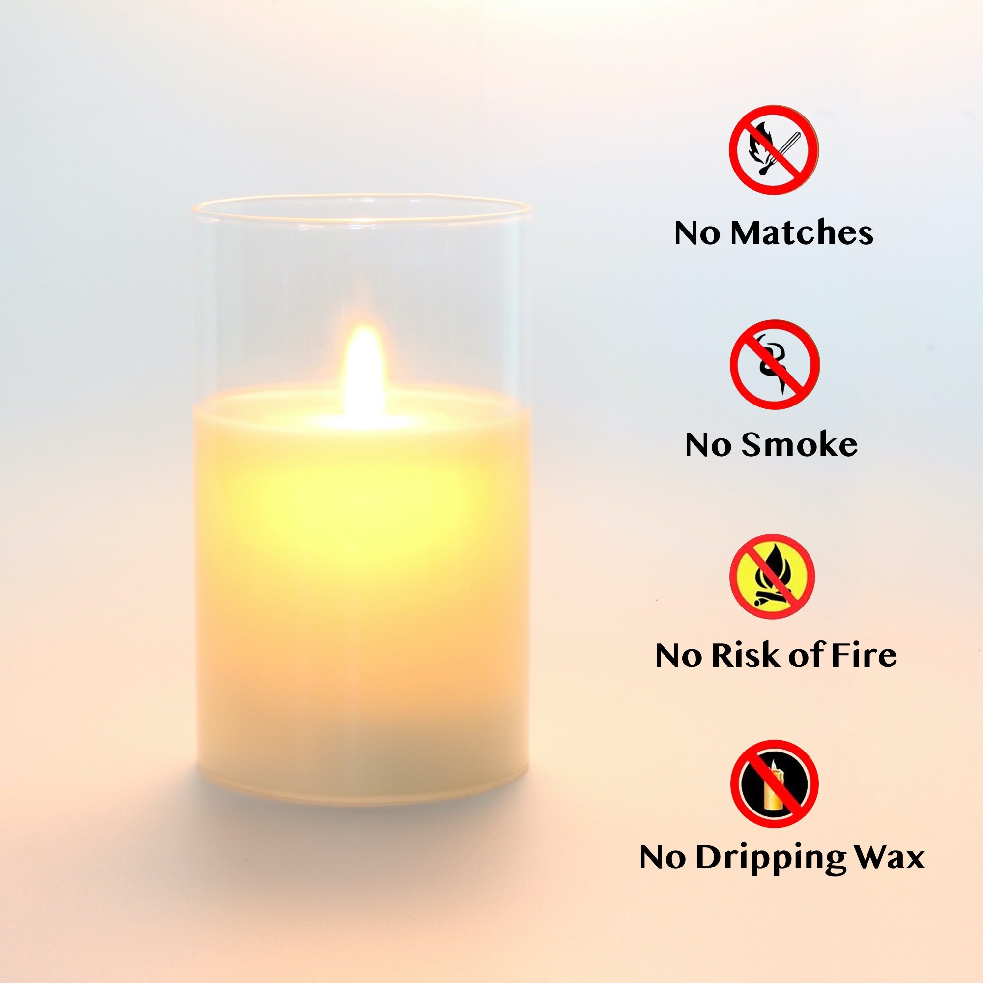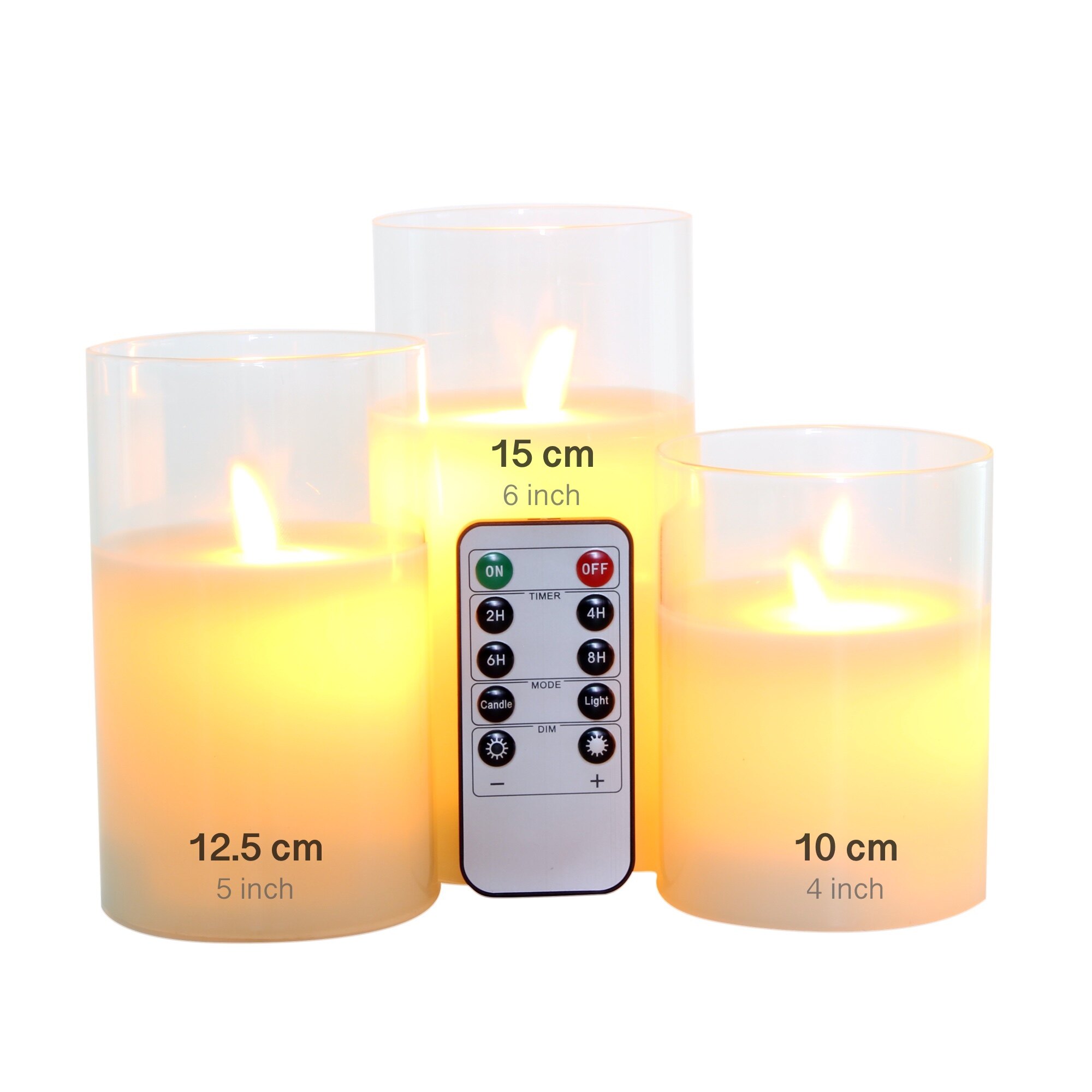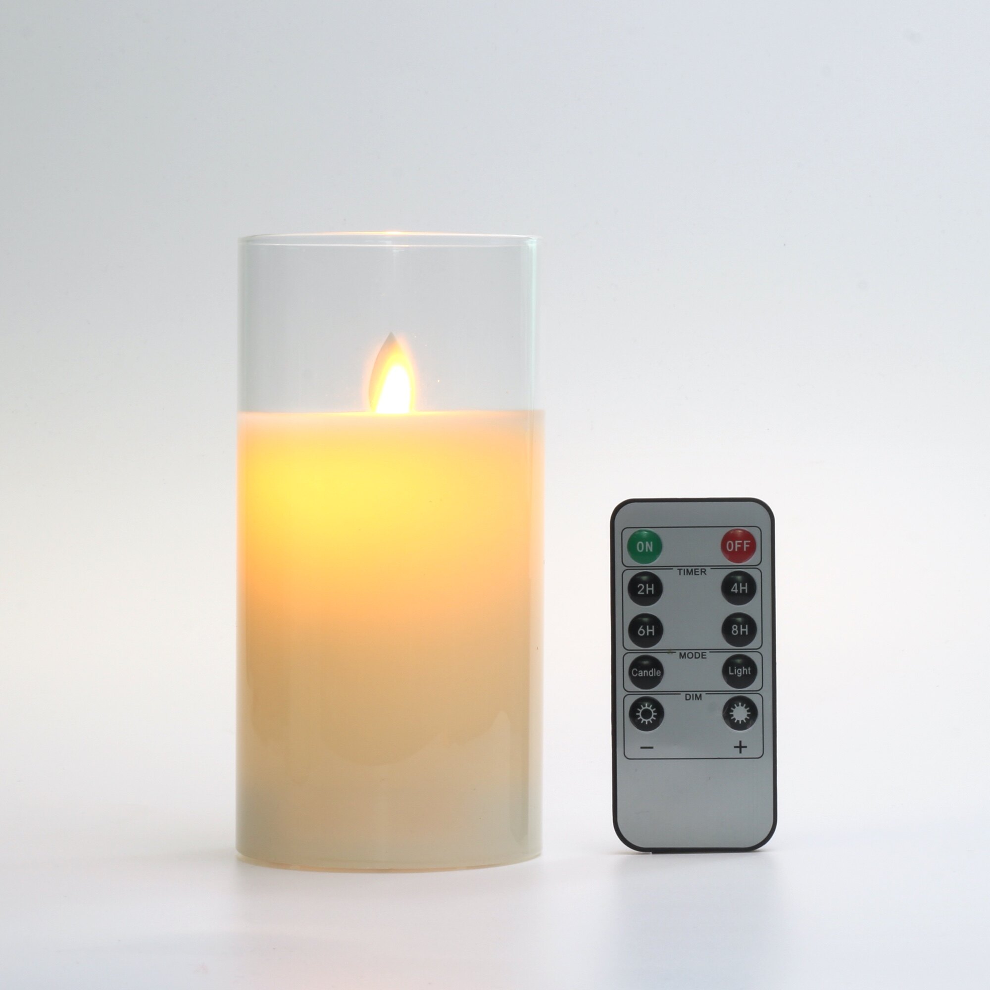 Glass Flameless Candles Set Real Wax Pillars & Moving Flame Wick LED Candles and 10-Key Remote Control with Timer, Battery Operated, Diameter 7.5cm