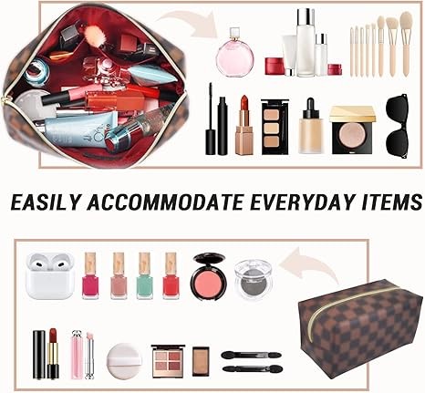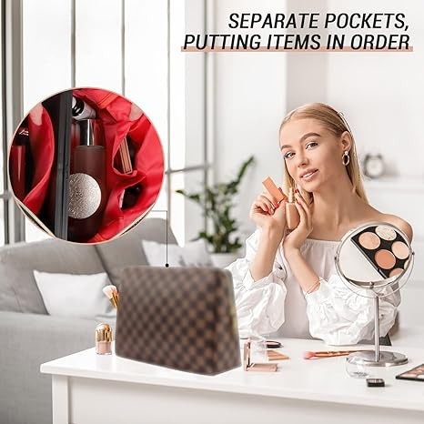 Checkered Cosmetic Bag, Portable Leather Cosmetic Bag, 2 Pieces Waterproof Travel Toiletry Bag for Women, Brown, Modern