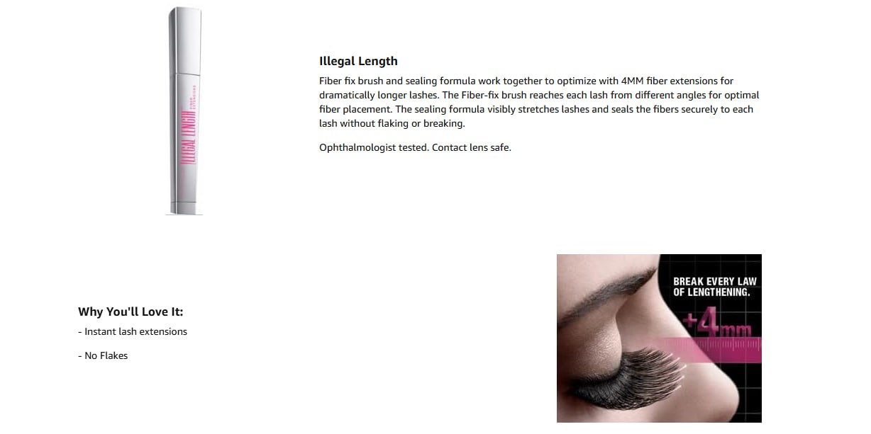 • Illegal Length Maybelline Mascara: Build lashes with 4 mm of measurable lash extension fibers and break every law of lengthening with our fiber lash mascara. Available in washable and waterproof mascara formulas