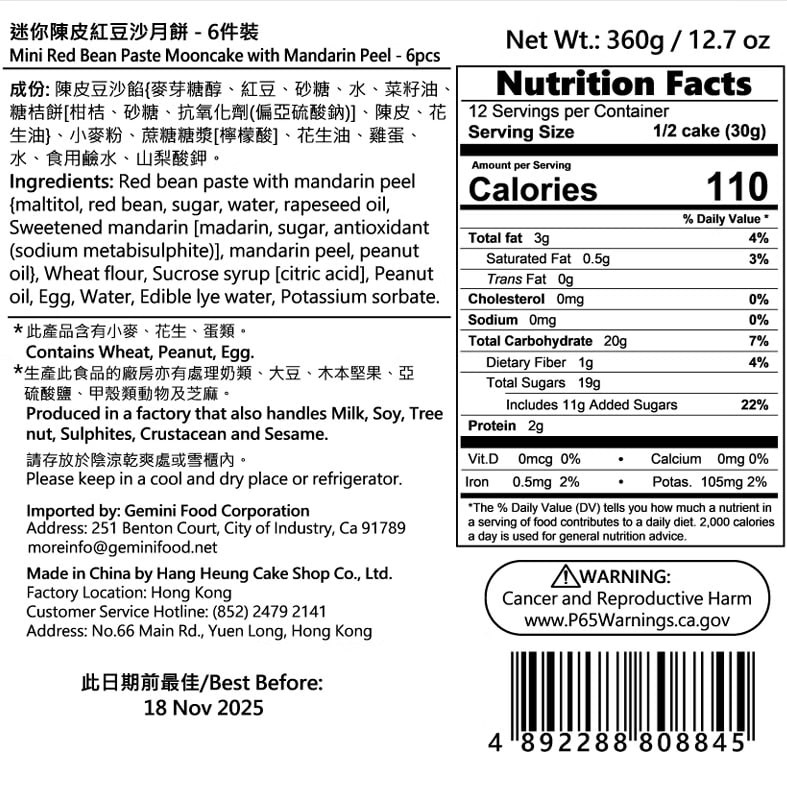 Hong Kong Hengxiang Mini Tangerine Peel and Red Bean Paste Mooncakes (6 pieces) [Time-honored Brand, Must-buy in Hong Kong] 360g