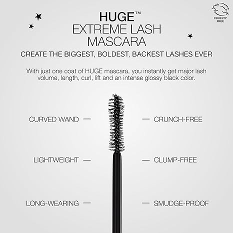 • MAXIMIZE VOLUME: With just one coat of HUGE mascara, you instantly get major lash volume, length, curl, lift and an intense glossy black color. No need for falsies, fake lashes, mascara primer or fiber mascara. An eyelash mascara for the biggest, boldest, blackest black lashes ever.