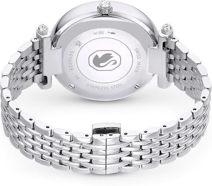 • Exquisite style: Featuring a white silver-tone dial embellished with Arabic numerals and approximately 1,000 crystals, this watch allows for maximum sparkle in the way that only Swarovski crystals can