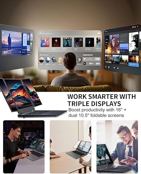 Triple-screen immersion for work and play: This 16.6-inch triple-screen laptop with dual 10.5-inch foldable displays offers a wide range of multitasking settings, perfect for developers, video editors, financial traders, and gamers. Whether you're working on multiple projects, editing 4K footage, or playing your favorite open-world RPG, this triple-screen laptop provides the screen space and flexibility you need on the go.